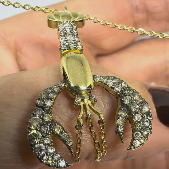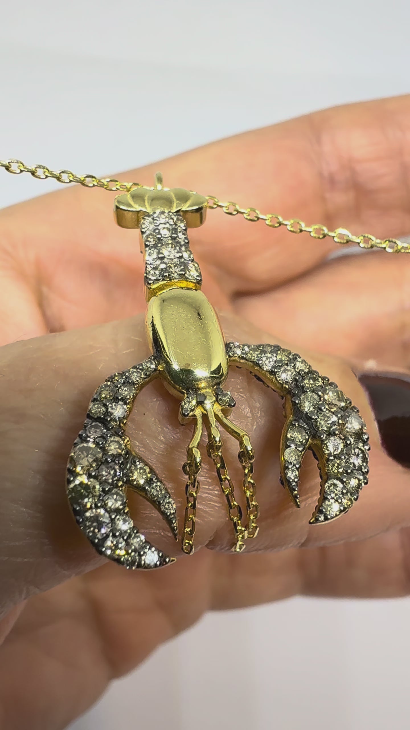Two-Way Lobster Necklace playful and versatile, this 18k gold necklace features a charming lobster pendant with a reversible design: one side in sapphire blue, the other in cognac diamonds. A statement of color and craftsmanship in one piece.
